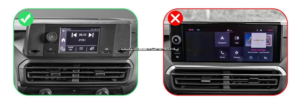 Citroen SpaceTourer Facelift / Jumpy III Facelift 10,1″ kijelzővel, 2024-2026 között gyártott modellekhez. Fekete színű kerettel. Quadlock (CanBus rendszerű) csatlakozóval. Stellantis: IVI, 10″ infotainment system, i-Connect system, NAC / RCC gyári, jellemzően navigációs rendszerekkel nem kompatibilis!